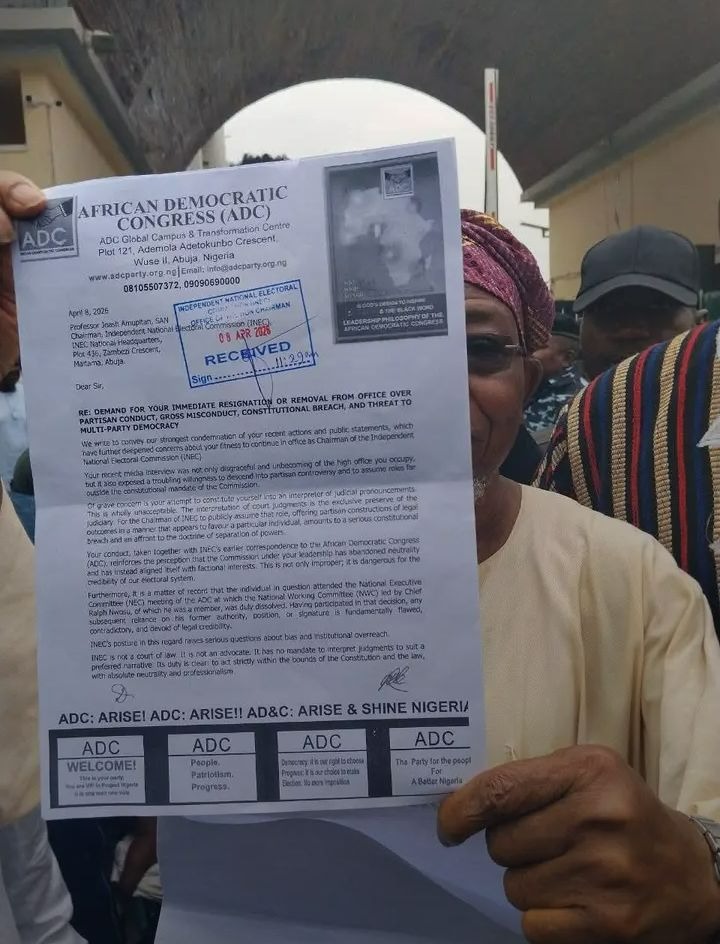 In the petition, the ADC accused the INEC Chairman of compromising the neutrality of the electoral body through recent public statements and actions it described as disgraceful and unbecoming of his office.