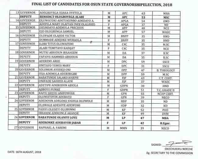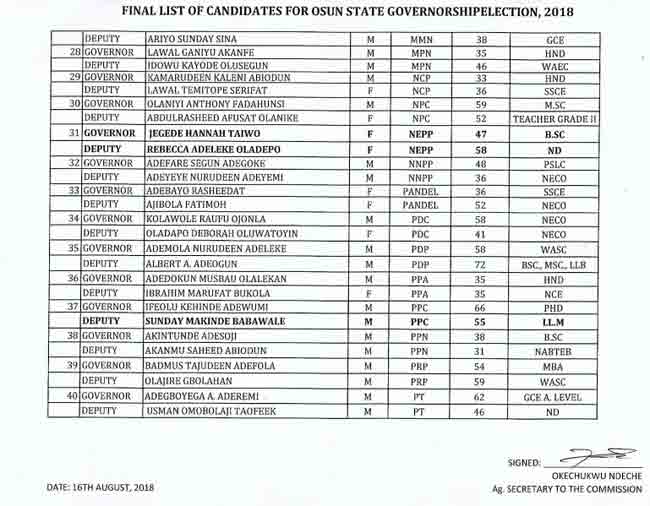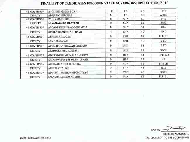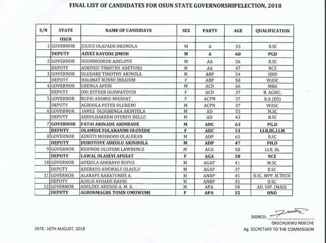 Also on the list are former Deputy Governor Iyiola Omisore of the Social Democratic Party of Nigeria (SDP), as well as the former Secretary to the State Government and Action Democratic Party (ADP) candidate, Adeoti Olalekan, among others.