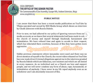 Pastor Biodun Fatoyinbo of the Commonwealth of Zion church has denied the rape allegations made against him by Busola, wife of popular singer, Timi Dakolo.