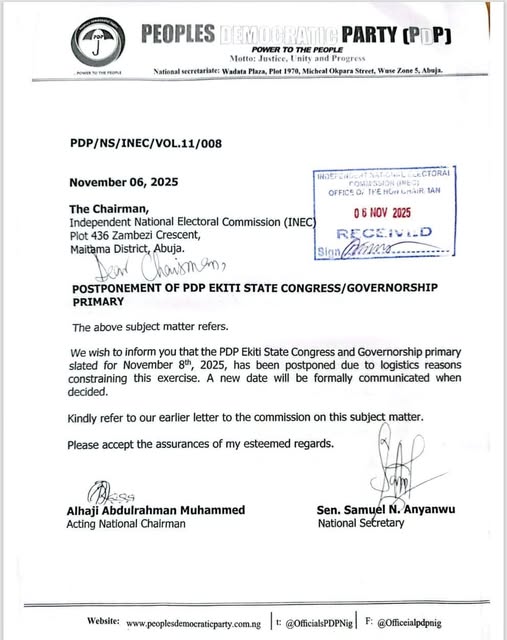 The letter, addressed to INEC Chairman, Prof. Joash Amupitan, reads, “We wish to inform you that the PDP Ekiti State Congress and Governorship Primary slated for November 8, 2025, has been postponed due to logistics reasons constraining this exercise.