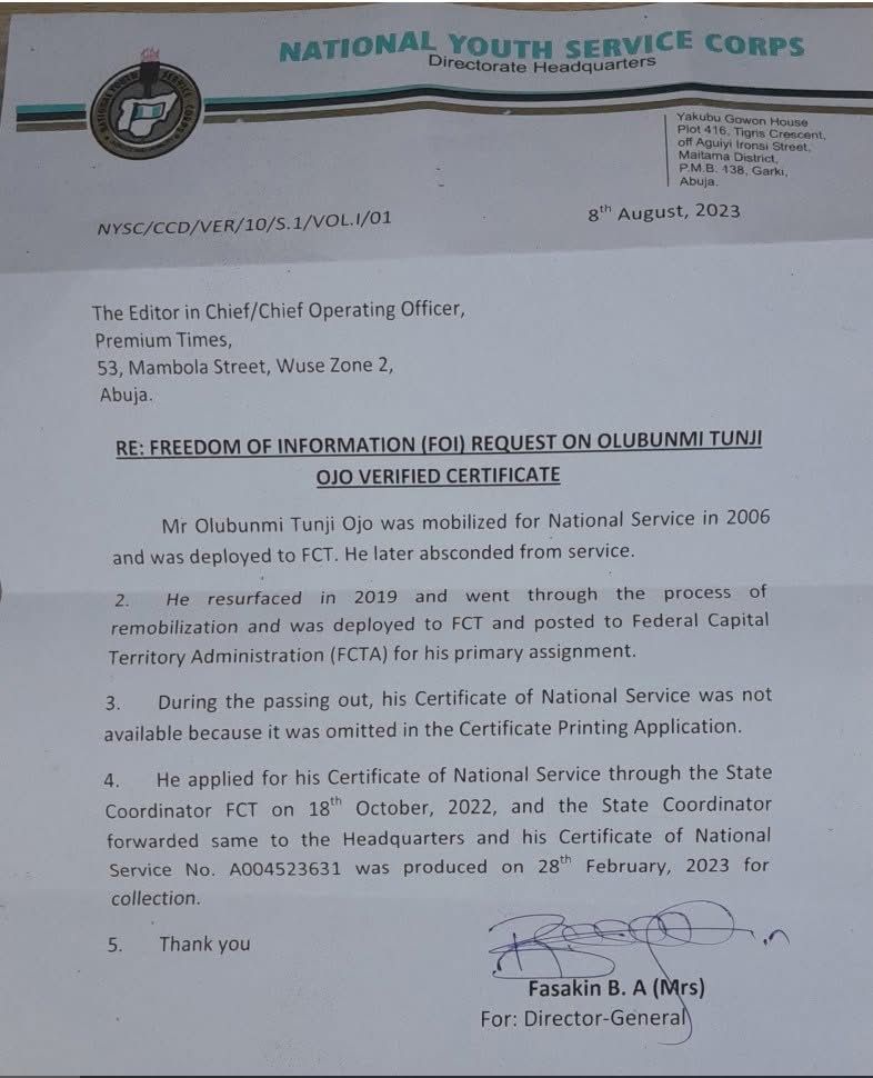 “He (Mr Tunji-Ojo) applied for his Certificate of National Service through the State Coordinator FCT on 18th October 2022, and the State Coordinator forwarded the same to the Headquarters, and his Certificate of National Service No. A004523631 was produced on 28th February 2023 for collection.”
