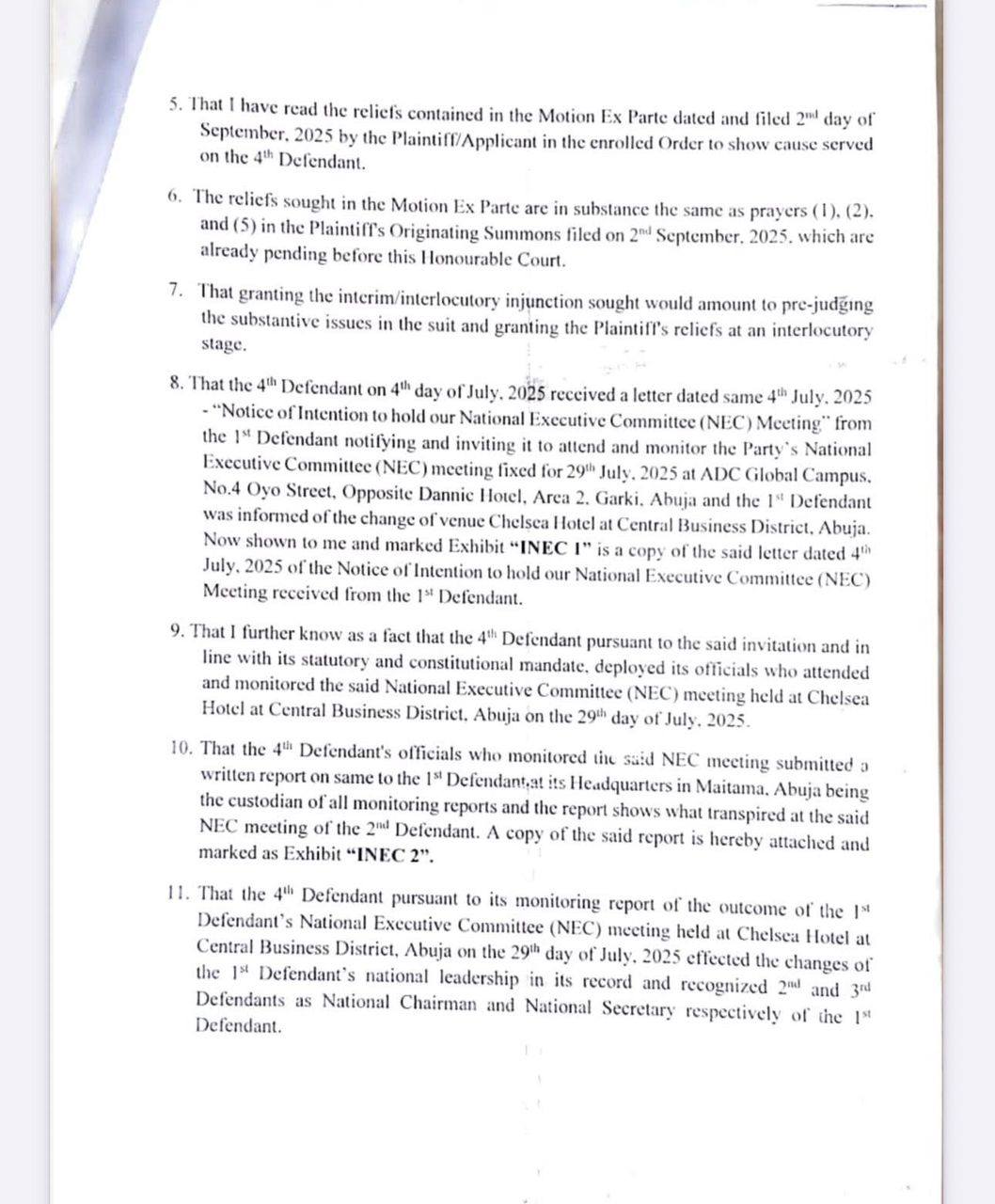 “That I further know as a fact that the 4th Defendant pursuant to the said invitation and in line with its statutory and constitutional mandate, deployed its officials who attended and monitored the said National Executive Committee (NEC) meeting held at Chelsea Hotel at Central Business District, Abuja on the 29th day of July, 2025.