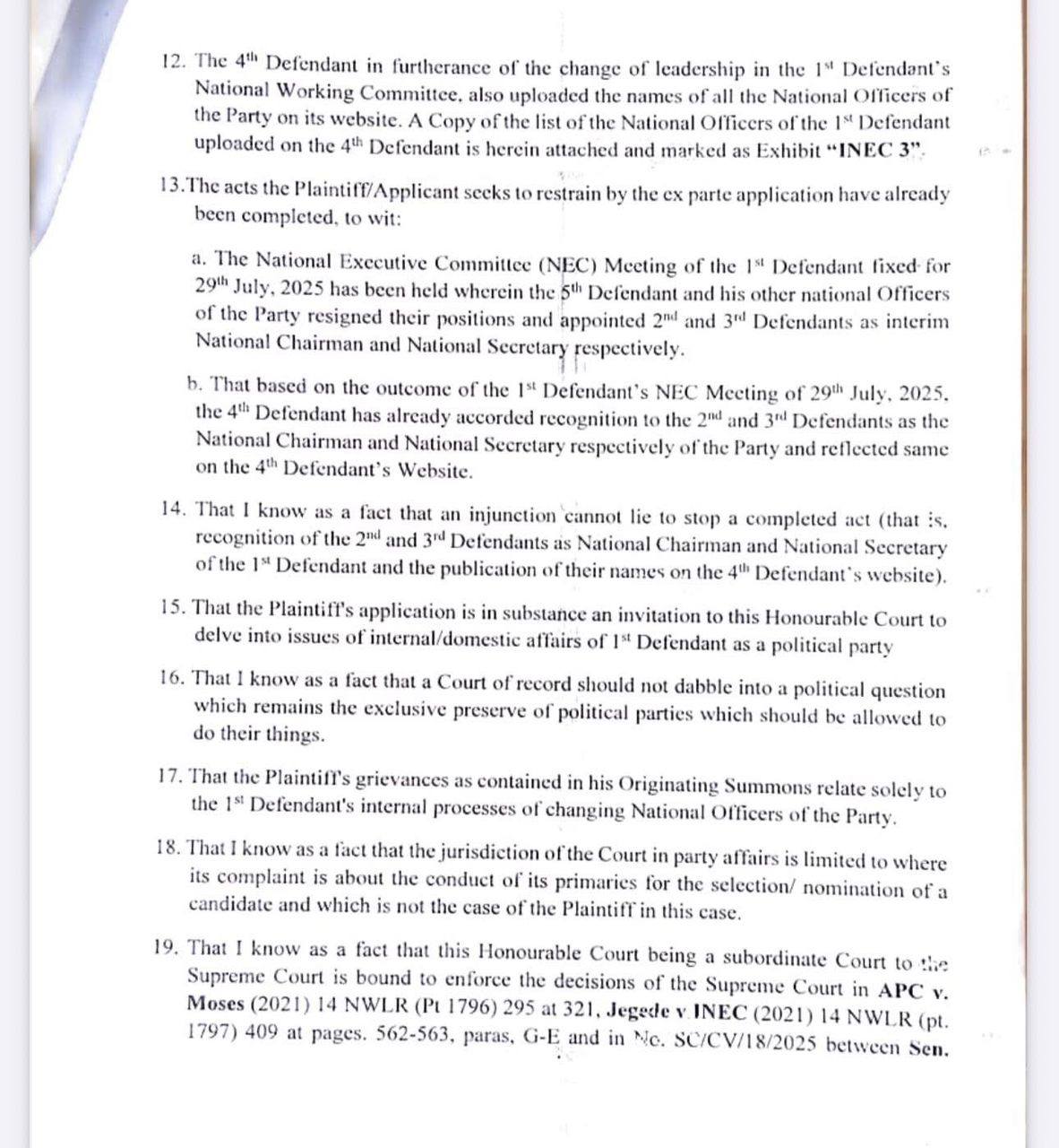“The National Executive Committee (NEC) Meeting of the 1st Defendant fixed for 29th July, 2025 has been held wherein the 5th Defendant and his other national Officers of the Party resigned their positions and appointed 2nd and 3rd Defendants as interim National Chairman and National Secretary respectively.