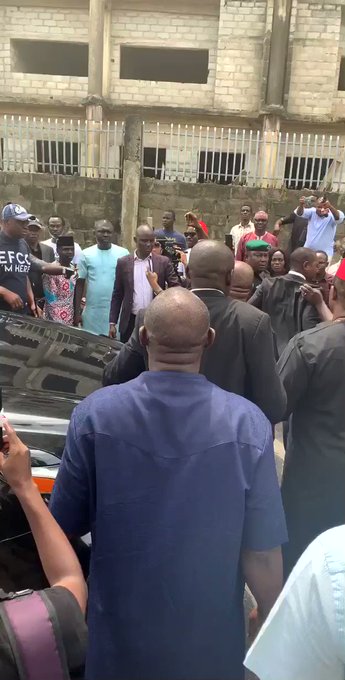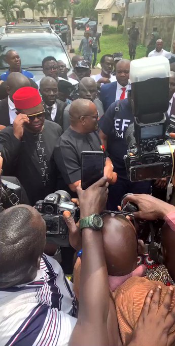 Wearing a T-Shirt with the inscription ‘EFCC I’m here’, the former governor arrived in the company of his supporters and members of his party including the Rivers State Governor, Nyesom Wike.