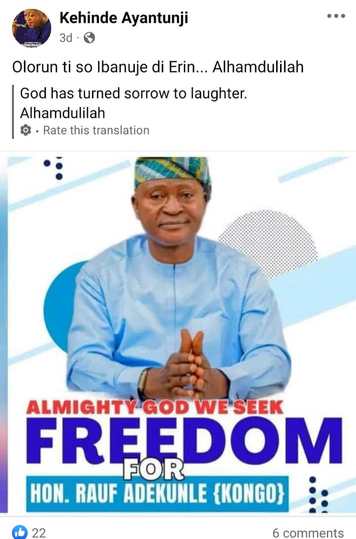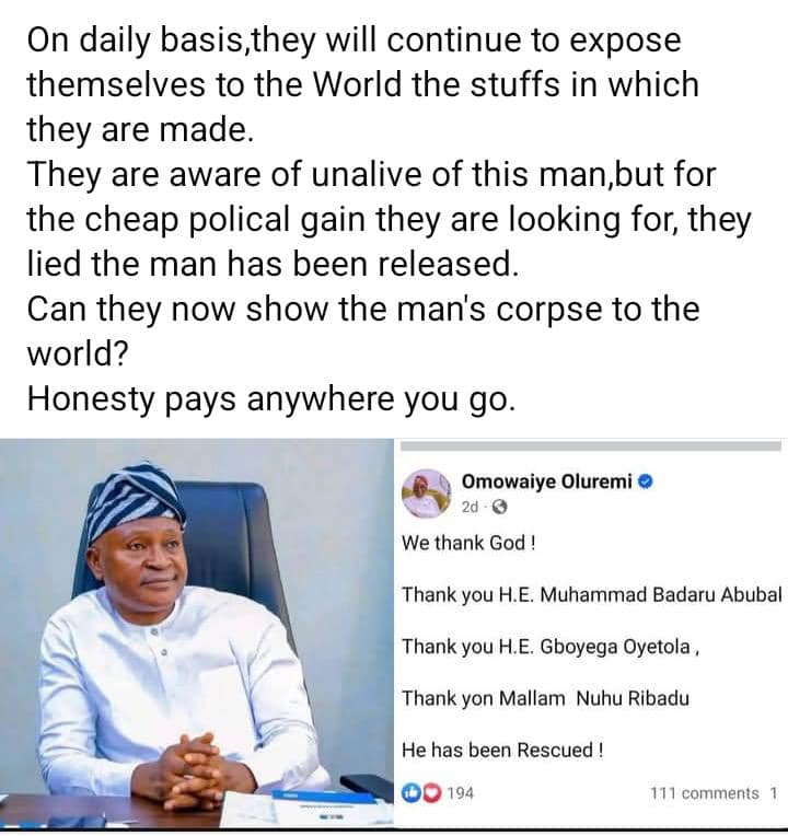 In a now-deleted Facebook post, Omowaiye wrote, “We thank God! Thank you, H.E. Muhammad Badaru Abubakar, Thank you, H.E Gboyega Oyetola, Thank you, Mallam Nuhu Ribadu. He has been rescued.”