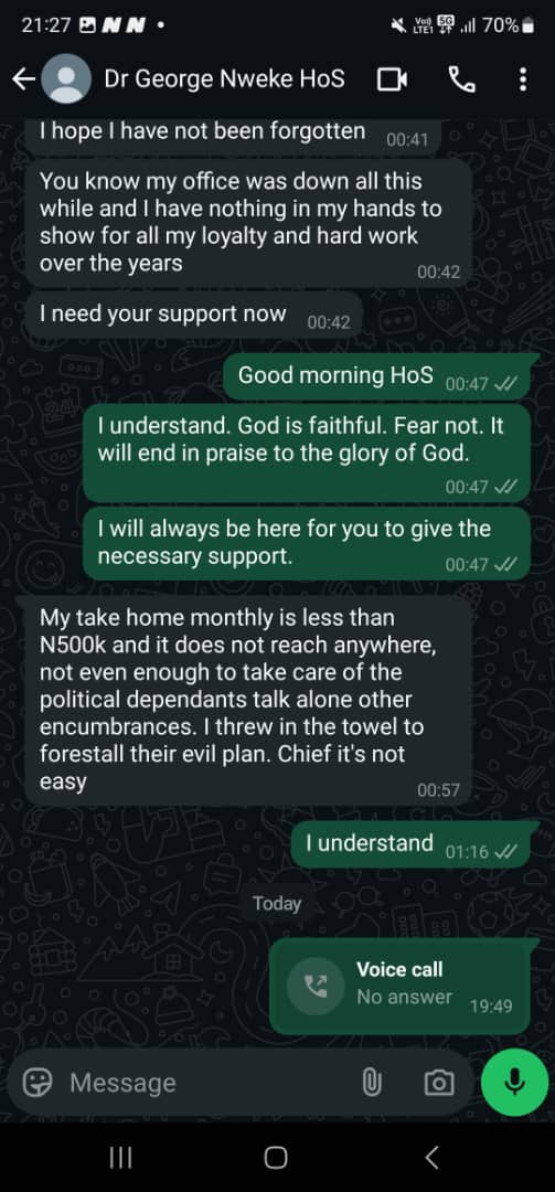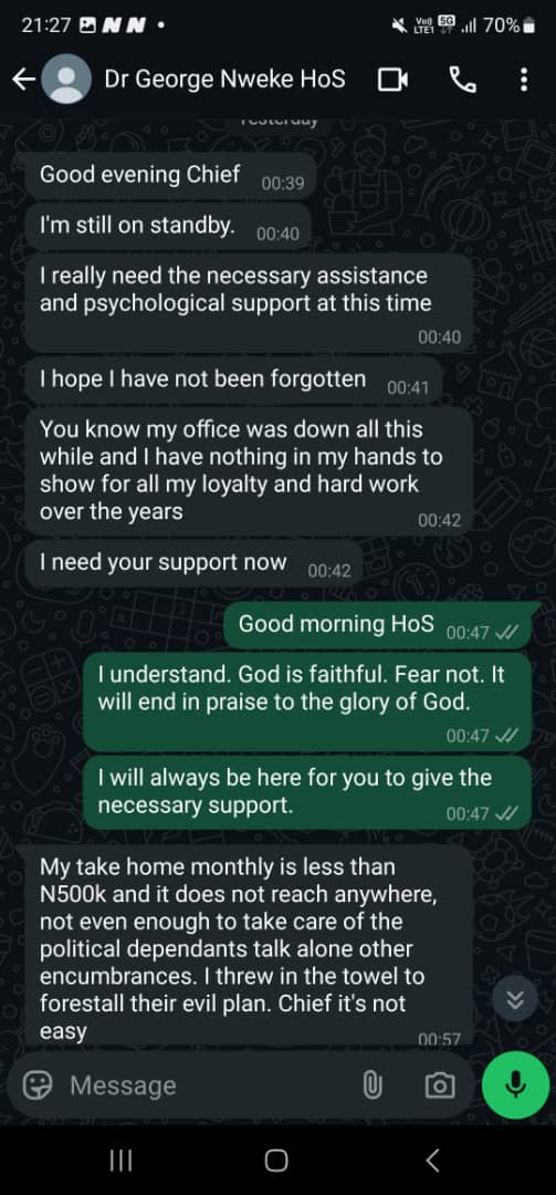 The governor backed his position with screenshots of chats said to have been between Mr Nwaeke and his Chief of Staff, Ederson Ehie.