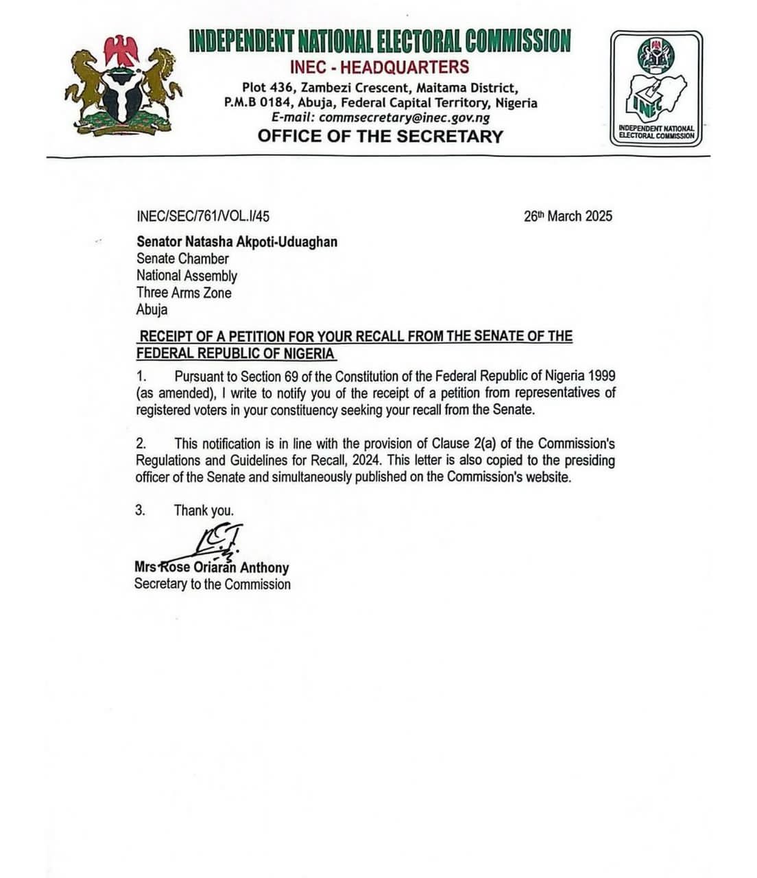 The Independent National Electoral Commission (INEC) has written to notify Natasha Akpoti-Uduaghan, the senator representing Kogi central, about the petition by constituents seeking her recall from the national assembly.