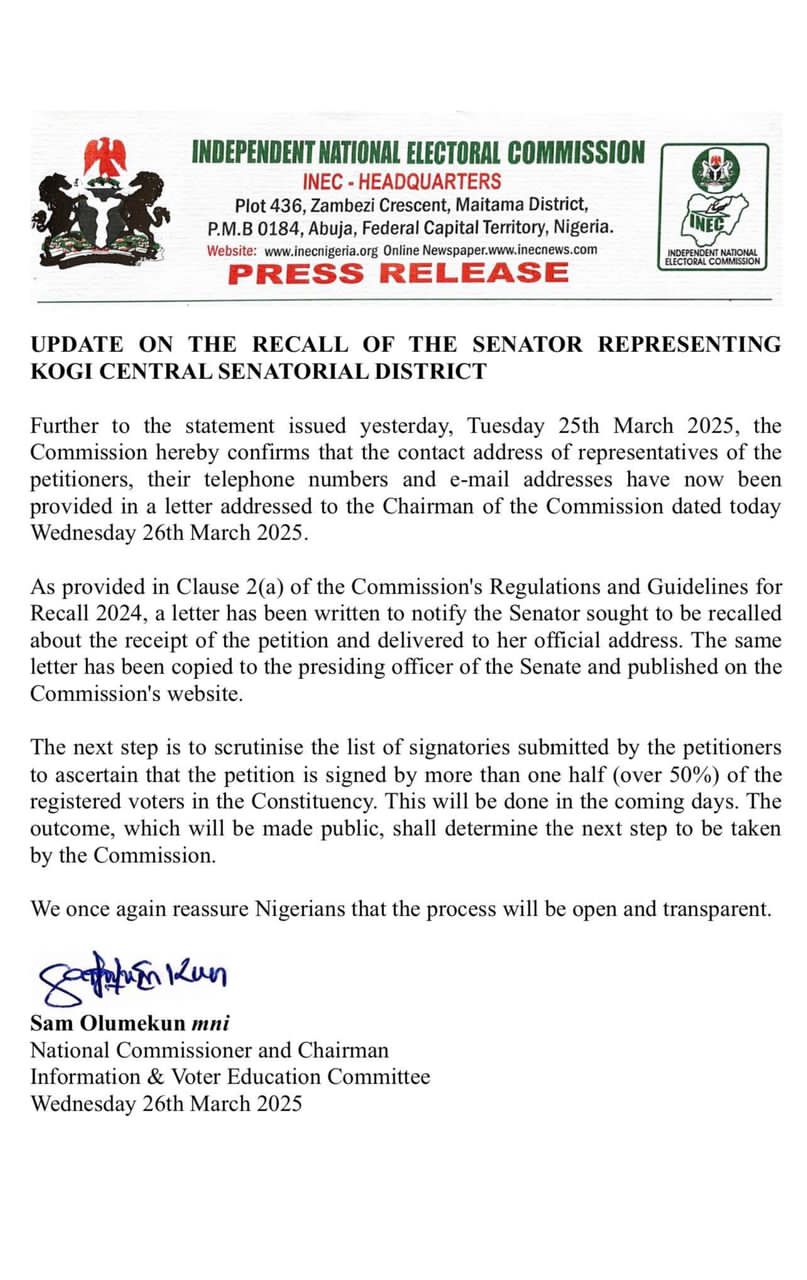 “As provided in Clause 2(a) of the Commission’s Regulations and Guidelines for Recall 2024, a letter has been written to notify the Senator sought to be recalled about the receipt of the petition and delivered to her official address. The same letter has been copied to the presiding officer of the Senate and published on the Commission’s website.
