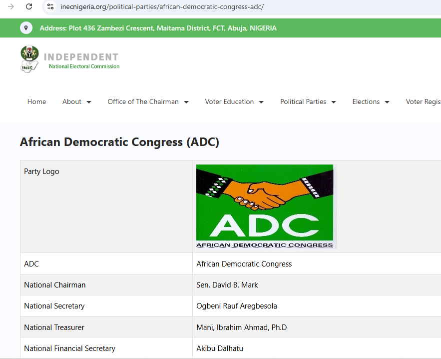 In a change to the party’s particulars on its website on Wednesday in Abuja, INEC listed the new executive members of the party, confirming the resolution of months of leadership tussle within the ADC.