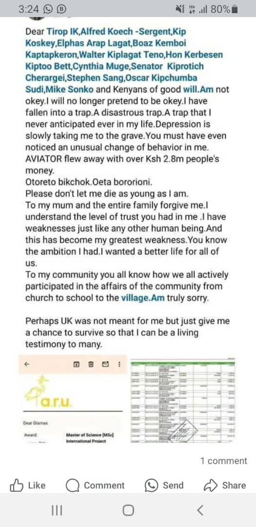 “I’m not okay; I will no longer pretend to be okay. I have fallen into a disastrous trap. A trap that I never anticipated in my life. Depression is slowly taking me to the grave. You must have even noticed an unusual change in my behaviour. Aviator flew away with over KSh 2.8 million of people’s money,” he stated as quoted by Tuko News, a popular Kenyan news website.
