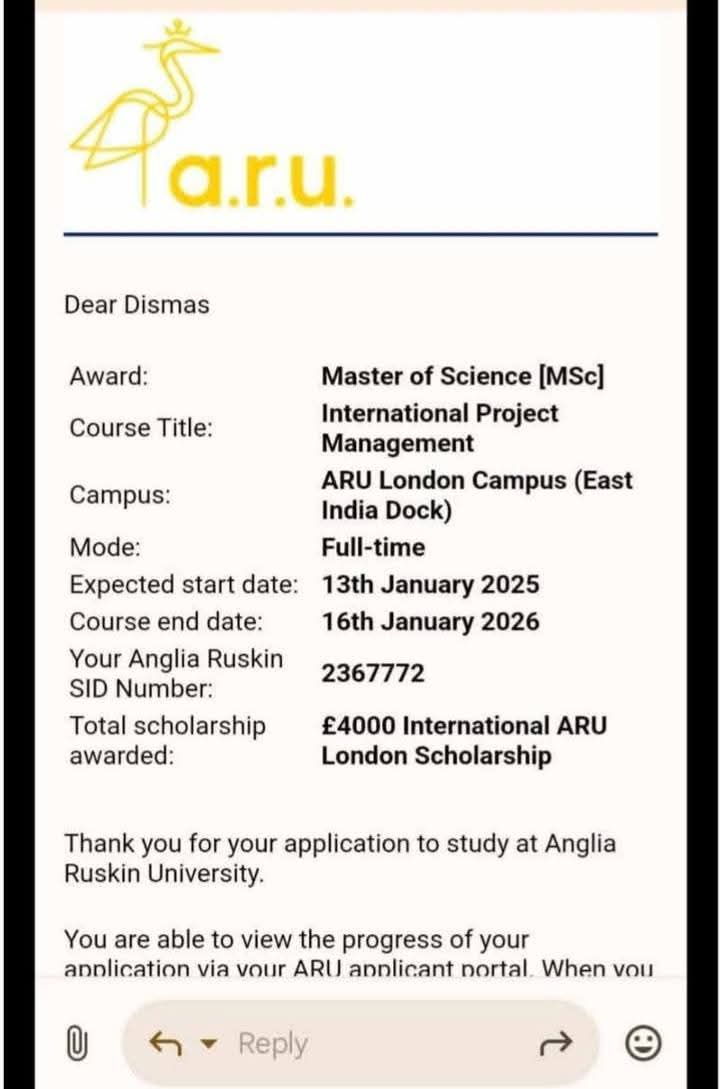 Mutai had secured a scholarship to study for a Master of Science in International Project Management at Anglia Ruskin University (ARU) in London.
