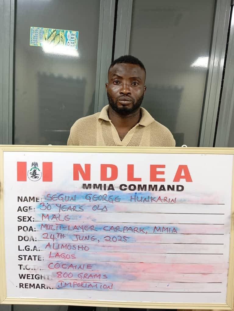 The National Drug Law Enforcement Agency (NDLEA) has arrested former international footballer Segun George Hunkarin and his associate, Ntoruka Emmanuel Chinedu, for allegedly attempting to smuggle cocaine into Nigeria through the Murtala Muhammed International Airport, Lagos.