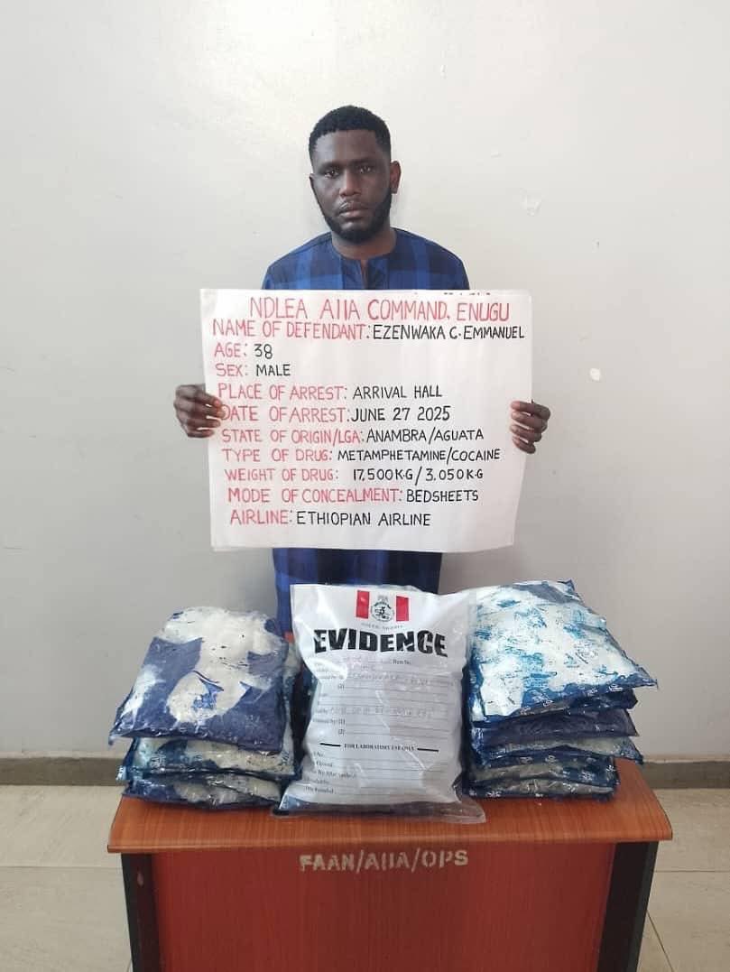 At Akanu Ibiam International Airport (AIIA) in Enugu, NDLEA operatives intercepted Ezenwaka Chibuzor Emmanuel, a 38-year-old bar attendant based in Maputo, Mozambique, with “17.5 kilograms of methamphetamine and 3.05 kilograms of cocaine concealed in his luggage”.
