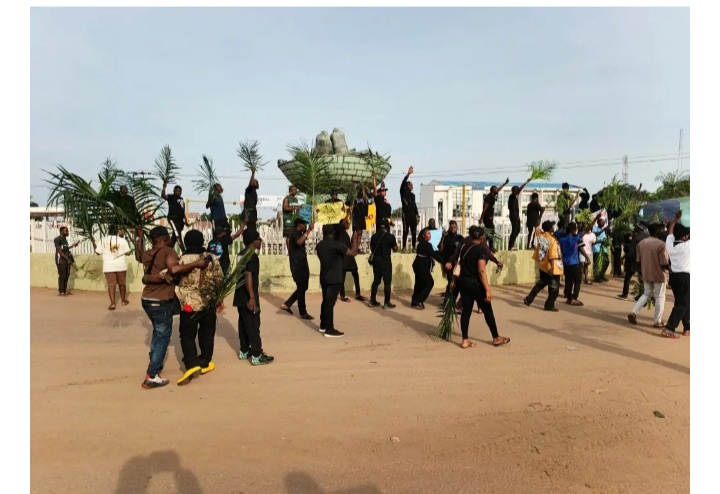 The demonstrators, dressed in black attire and carrying palm fronds and placards with various inscriptions, barricaded the ever-busy road, disrupting vehicular movement and demanding immediate action to end the bloodshed.