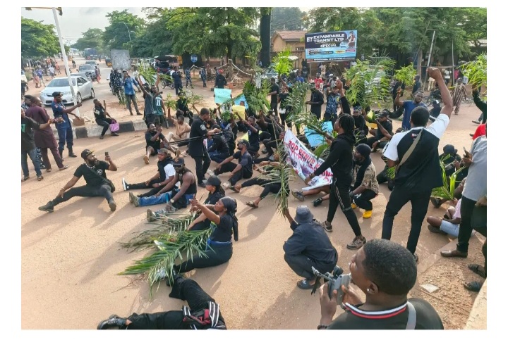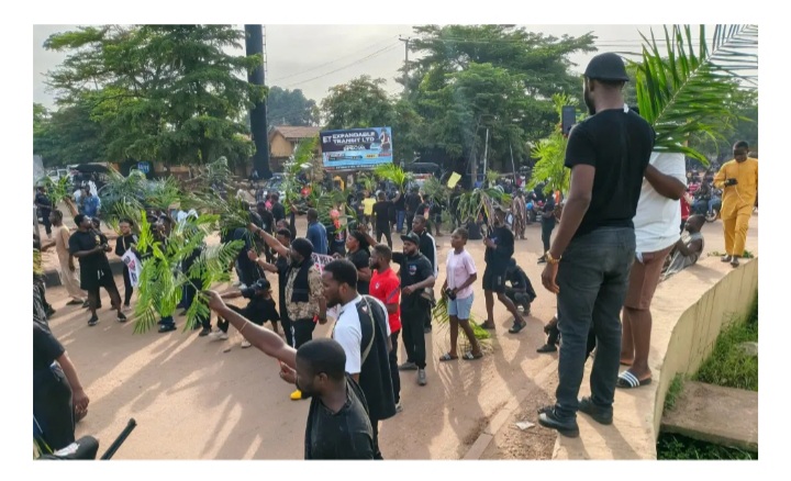 The demonstrators, dressed in black attire and carrying palm fronds and placards with various inscriptions, barricaded the ever-busy road, disrupting vehicular movement and demanding immediate action to end the bloodshed.