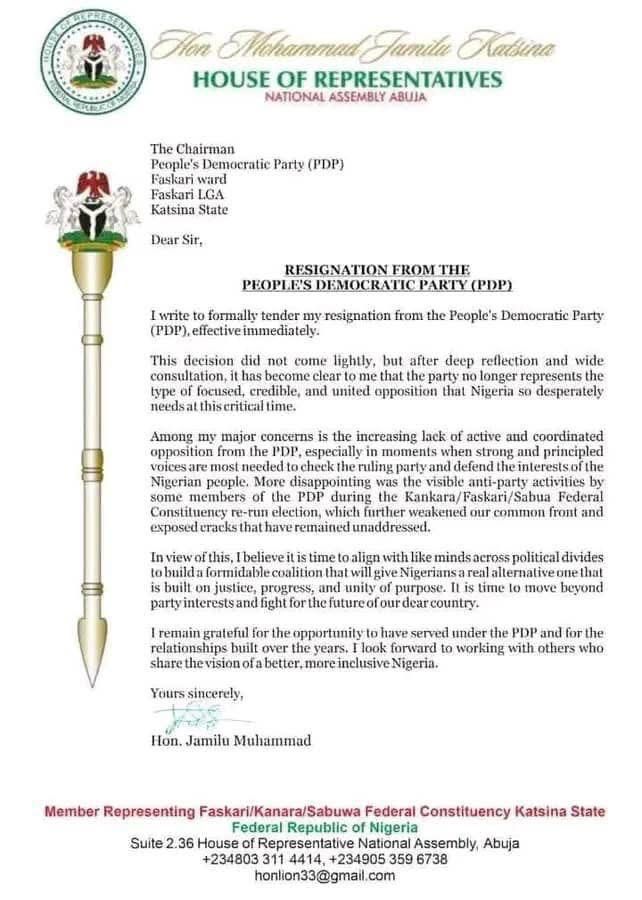 The member representing Faskari/Kanara/Sabuwa Federal Constituency in the House of Representatives, Rep. Muhammad Jamilu Katsina, has resigned from the Peoples Democratic Party (PDP), accusing the party of failing to provide a credible and united opposition.
