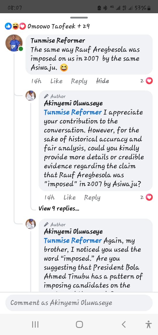 “For the sake of historical accuracy… could you kindly provide more details or credible evidence regarding the claim that Rauf Aregbesola was ‘imposed’ in 2007 by Asiwaju?”