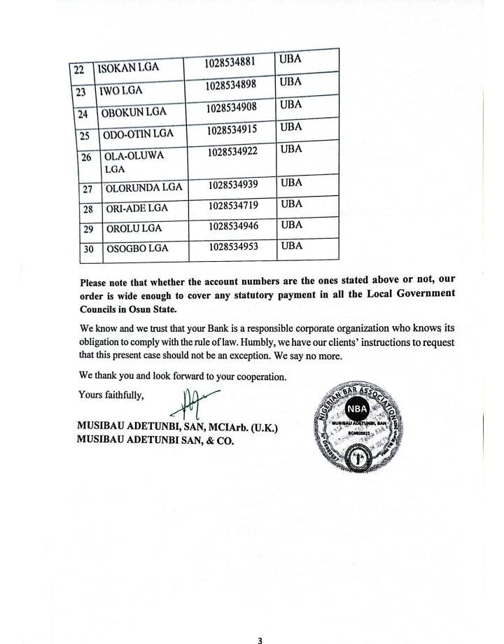 In a letter dated 26th September 2025, Osun State Government’s lead counsel, Musibau Adetunbi (SAN), reminded UBA of the subsisting court order, cautioning the bank against releasing any funds pending the determination of the motion on notice.