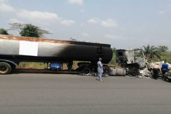 It was gathered that the incident occurred around 5.00am by the Isara bridge stretch of the highway with two vehicles with registration number ZT728 KLD(Mazda bus) and a nondescript tanker involved.