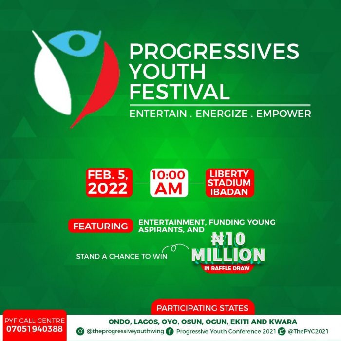 “For us to be part of Nigeria’s political reform, mobilization is key. On Saturday, February 5th 2022, we are bringing one hundred thousand youths together in Ibadan at Liberty Stadium for the Progressives Youth Festival. This festival is the first ever in the South-West for the youth and by the youth, and the aim is to entertain, empower, and energize”, he said.