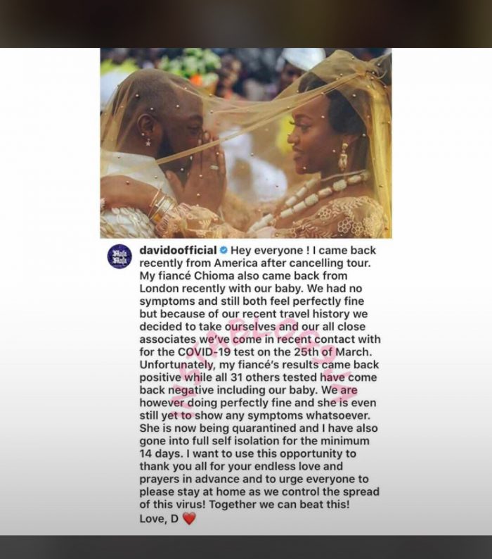 Davido’s Fiancée, Chioma Contracts COVID-19