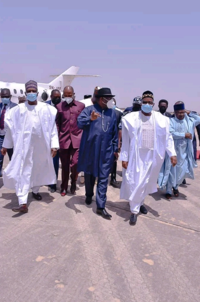News Photonews Politics Just In: Former President Goodluck Jonathan Arrives Bauchi (Photos) By PublishedApril 6, 2021 Former President Goodluck Ebele Jonathan has just arrived Bauchi, the Bauchi State Capital, Tuesday afternoon. He was welcomed by the State Governor, Bala Mohammed and members of the state cabinet. Details of the visit is still sketchy. Related posts: BREAKING: Former Heads of State, Goodluck Jonathan, Governors Attend Council Of State Meeting Amaechi hails ex-President Goodluck Jonathan El-Rufai Challenges Ex-president Goodluck Jonathan An Afternoon With Ex-President Goodluck Jonathan