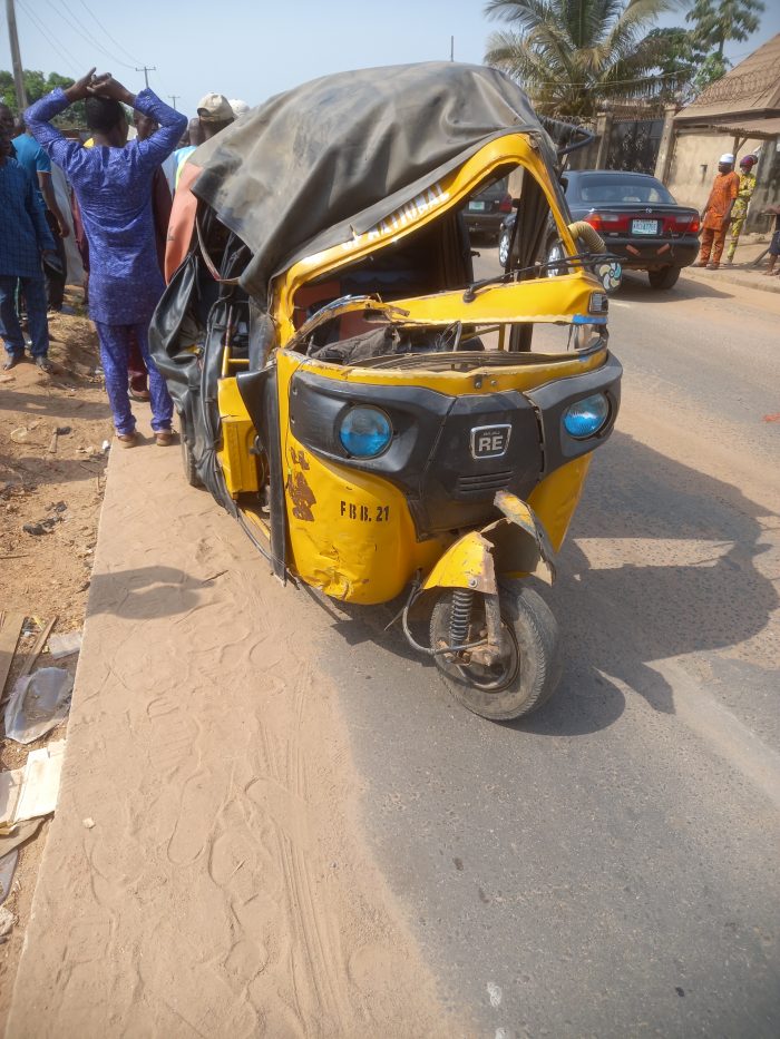 An eyewitness simply identified as Yinka said that the car was trying dodge a pot-hole when the driver lost control and hit the tricycle conveying about 4 persons.