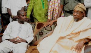 Governor, State of Osun, Ogbeni Rauf Aregbesola with the husband of the deceased Mr Kolawole Awotunde, during the condolence visit to the families of Permanent Secretary Bureau of General Service office of the governor, Mrs Olufunke Kolawole at their Residents in Ofatedo on Saturday.