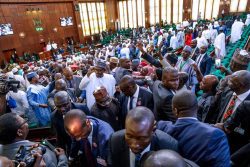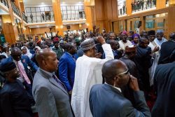 featured Photonews PHOTONEWS: Buhari Presents 2019 Budget To NASS By PublishedDecember 19, 2018 President Muhammadu Buhari on Wednesday presented the 2019 Budget draft estimates tagged the “Next Level Budget” to a joint session of the National Assembly. The Budget Presentation is the last to the 8th National Assembly. Here are photos from the ceremony Related posts: PHOTONEWS: Oyetola Presents 2019 Budget To Osun Assembly President Buhari Presents 2022 Budget To NASS On Thursday Buhari Presents N20.5trn 2023 Budget Proposal To NASS NASS To Transmit Approved N9.82trn 2019 Budget To Buhari On Thursday