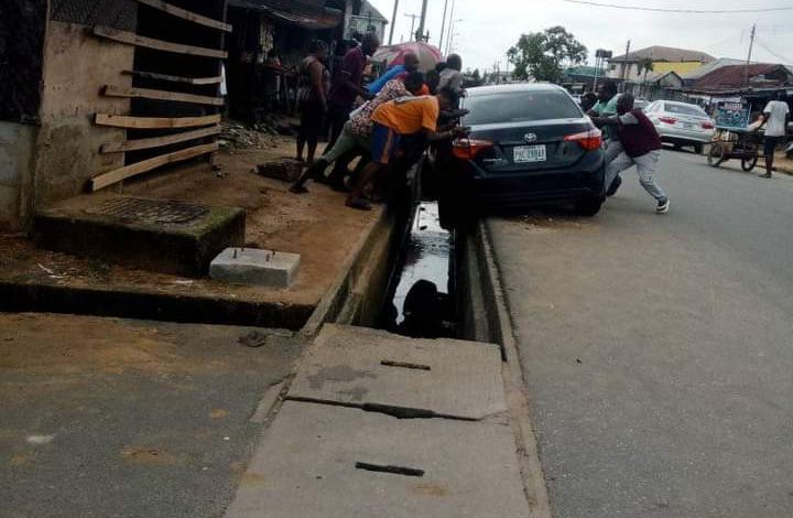 Sharing photos from the incident, the user said, “Happened this afternoon in Rumueme area of Port Harcourt. A Man drove his car to car wash, the car washer after washing the car decided to test his driving experience, the next thing we saw him and the car inside the drainage.