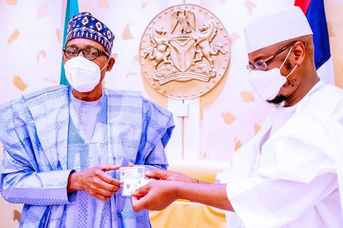 President Muhammadu Buhari today received his National Identity Number Card from the Minister of Communication and Digital Economy, Isa Pantami.