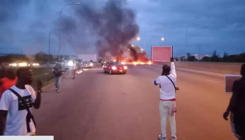 #BuhariMustGo Protesters Storm Abuja Block Airport Road